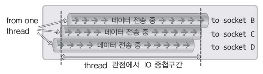 하나의 쓰레드 내에서 동시에 둘 이상의 영역으로 데이터를 전송함으로 인해서 입출력이 중첩되는 상황을 가리켜 'IO 중첨' 이라 한다. 이러한 일이 가능하려면 기본적으로 IO 입출력 함수는 논블로킹 (바로 반환하는) 함수여야 된다. 위 그림에서 각 소켓 B, C, D을 목적으로하는 출력버퍼를 통해 데이터를 중첩하여 보내는 모델이 Overlapped IO 모델이자 비동기 IO 모델이라 할 수 있다.