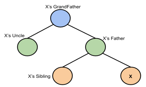 (3-1) x의 uncle(같은 조부모를 가지는 부모의 형제 노드)이 red인 경우, parent와 uncle은 모두 red이므로 parent와 uncle을 black으로 칠하고 grandparent부터 x로 생각하고 3번을 다시 검사한다.