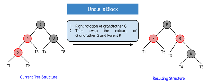 parent와 노드 x는 grandparent를 기준으로 왼쪽에 있으며 RightRotate(G)와 SwapColor(G,P) 연산을 해준다.