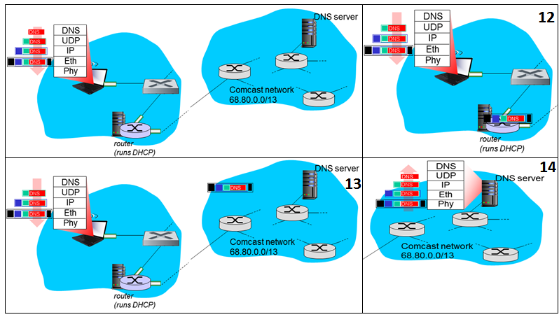 13) DNS 쿼리는 학교 네트워크(첫 번째 라우터)에서 DNS 서버를 포함하고 있는 네트워크까지 각종 라우팅 알고리즘을 통해 Intra-AS, Inter-AS 간 전송이 이루어진다.