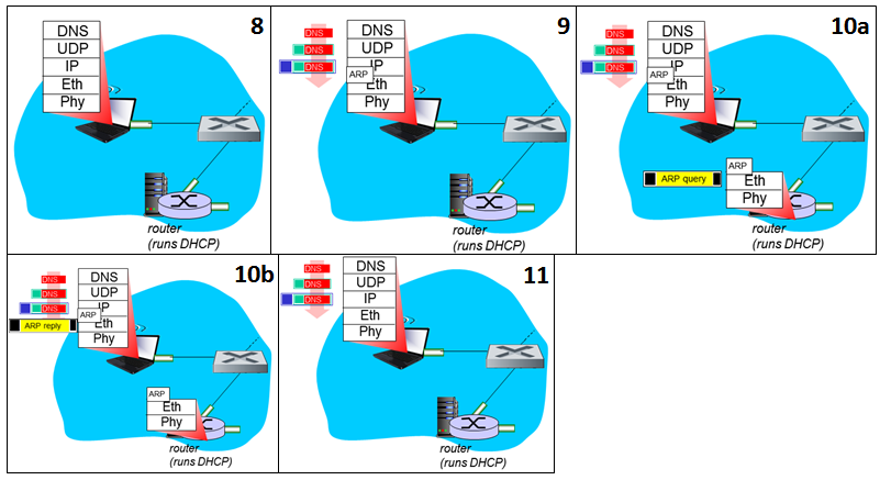 9) DNS 쿼리가 생성되고 UDP, IP, Ethernet 프로토콜로 캡슐화된다.