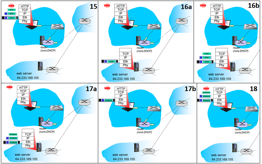 16) TCP segment에서 SYN 비트가 1인 패킷이 웹 서버로 전송된다.