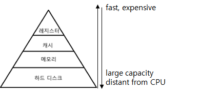 레지스터와 캐시 같은 메모리는 CPU와 가까우며 시스템 버스를 통해 연산을 위해 빠르게 데이터를 옮길 수 있지만 가격이 비싸므로 사용자가 필요한 모든 데이터를 저장하기는 힘들다.