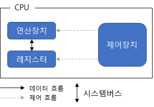 연산장치, 레지스터, 제어장치로 구성되고 이들은 내부 버스로 연결