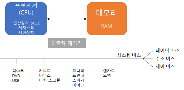구조: 프로세서 <--시스템 버스--> 주 메모리 <--시스템 버스--> (입출력 제어기) <--시스템 버스--> 외부 입출력 장치