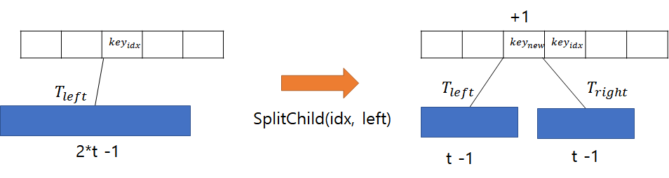 key_idx를 가지고 있는 부모 노드를 기준으로 새로운 키를 삽입해야할 자식 노드 T_left (= children[idx])가 꽉 찬 상태라면 먼저 두개로 분리하는 작업을 해준다. 꽉 찬 상태의 노드는 2*t-1 키를 가지고 있는 데 이를 두 개로 분리하고 가운데 키를 부모 노드에 삽입한다.