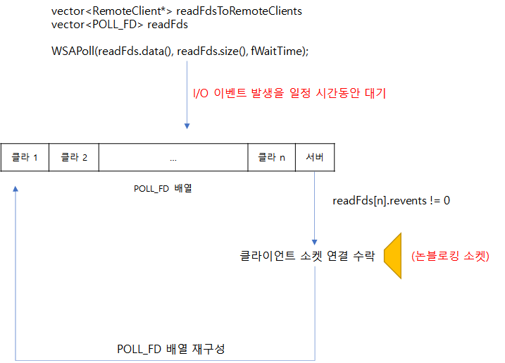 관찰하고자 하는 소켓 디스크립터 배열을 전달한다. timeout을 지정하여 일정 시간 동안 이벤트가 발생하지 않거나 I/O이벤트가 발생했을 때 함수를 빠져나온다. (논블로킹)
