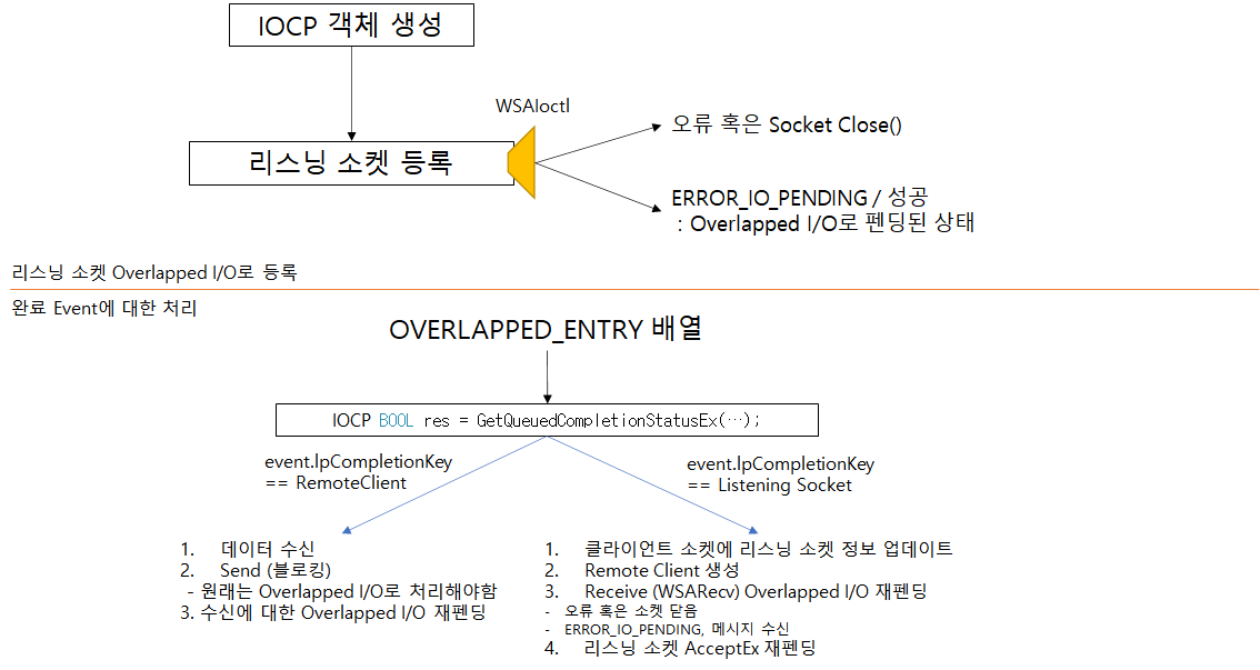 그 이후 해당 AcceptEx를 호출해서 Overlapped I/O를 펜딩시켜놓으면 Completion Port의 완료 알림으로 클라이언트의 연결 요청을 수락할 수 있다.