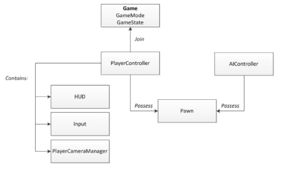 - Controller : Pawn을 조종하기 위한 클래스로 AIController와 PlayerController로 파생된다. "Possess"라는 메세드로 폰을 조종할 수 있다.