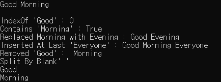 WriteLine("IndexOf 'Good' : {0}", greeting.IndexOf("Good"));