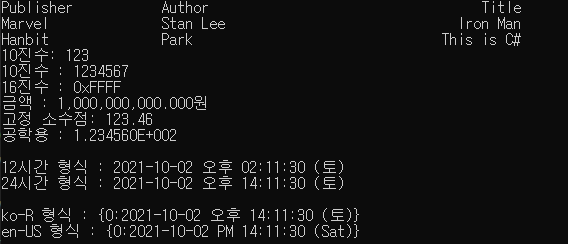 WriteLine("10진수: {0:D}", 123);