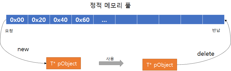 임의의 타입 T에 배수만큼 큰 힙 메모리를 할당하여 T* pObject = new T;를 통해 동적할당할때 마다 미리 할당한 메모리 블록으로 부터 한 조각을 T 타입으로 초기화하여 반납하고 delete pObject;를 할때 다시 해당 조각을 반납한다.