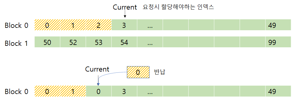 조각 마다 인덱스를 부여하고 해당 인덱스는 큰 블록을 생성할 때 만들어준다. 메모리 요청시 현재 꺼내야하는 인덱스를 가지고 메모리 블록과 블록에서 몇번째 조각인지 알아내어 메모리를 준다.