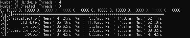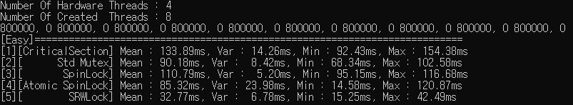 SRWLock은 두 모두 중 선택하여 락을 얻을 수 있고 Reader는 shared 모드로 Writer는 exclusive 모드로 락을 얻어야한다. 하지만 FIFO나 공평한 정책을 사용하지 않기 때문에 어떤 쓰레드가 소유권을 먼저 획득할 지 보장이 없다.