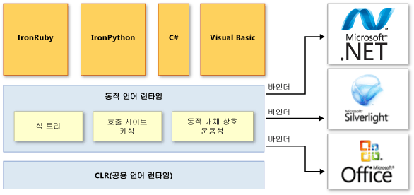 .NET에서 제공하는 기능으로 python이나 ruby와 같이 컴파일 없이 실행하는 동적 언어를 C#에서 실행할 수 있게 해준다. 기존 CLR(Common Language Runtime) 환경 위에 DLR(Dynamic Language Runtime) 환경을 만들어주고 DLR 위에서 파이썬이나 루비와 같은 언어로 된 코드를 동적으로 실행하는 원리이다. CLR이 DLR API를 기반으로 구현된 동적 언어를 호스팅 구조이다.