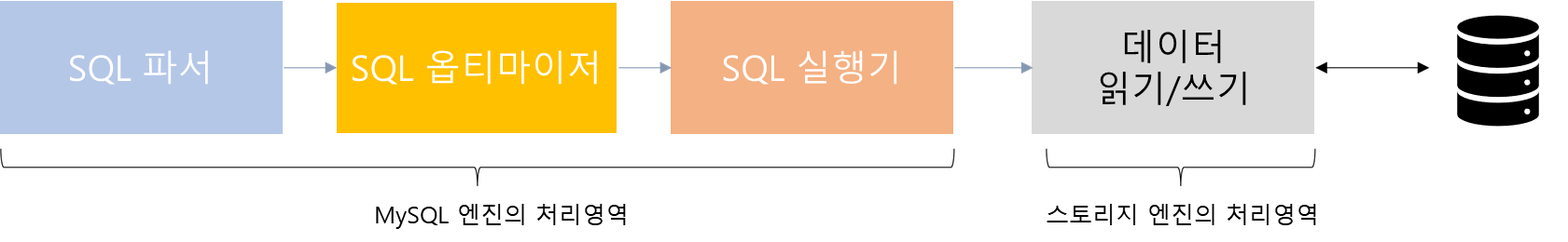 SQL 구문과 관련된 부분은 모두 MySQL 엔진이 처리하며 이후에 디스크로 부터 읽기/쓰기 작업만 스토리지 엔진이 처리한다. 스토리지 엔진에 작업을 요청하는 것을 핸들러라고 하며 MySQL 엔진이 요청한다.