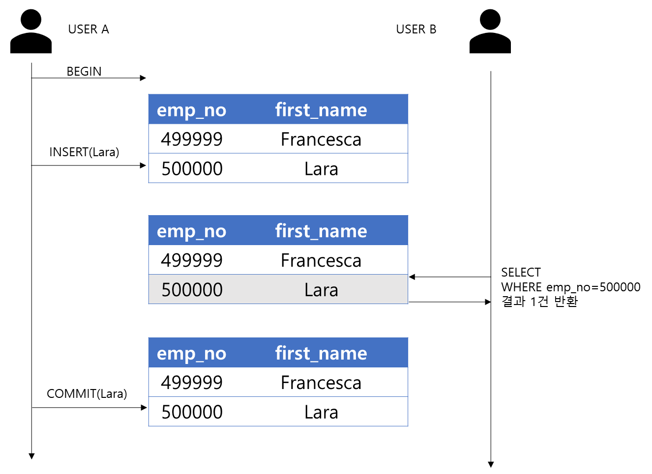 유저 A가 트랜잭션 도중 emp_no=500000인 레코드를 삽입하였다. 유저 B는 유저 A가 COMMIT을 하든 ROLLBACK을 하든 상관없이 중간 SELECT 조회로 해당 중간 결과를 볼 수 있으며 이는 유저 A가 롤백을 할 경우 유저 B는 해당 테이블에서 제거된 비정상적인 레코드를 보게 된다.