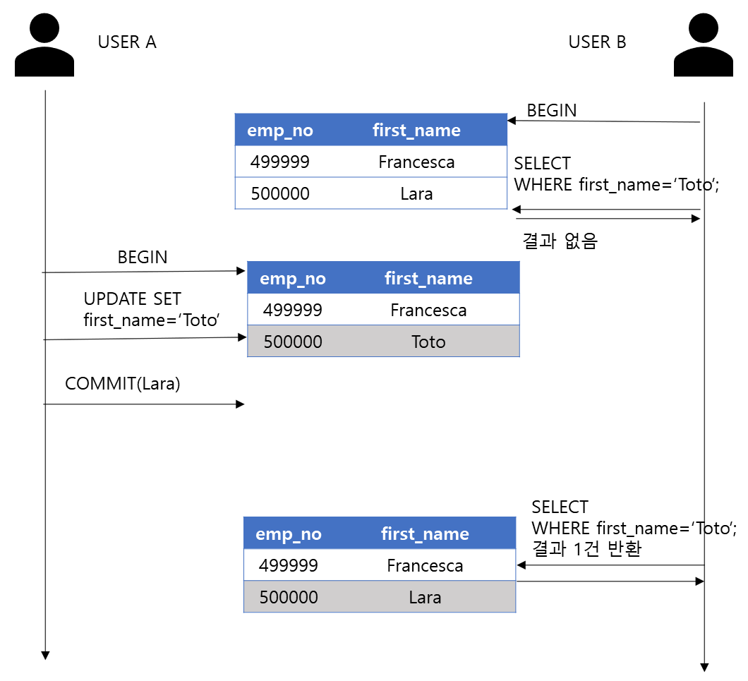 유저 B가 트랜잭션을 시작하고 first_name='Toto'인 레코드를 조회하지만 해당 테이블에 조건에 맞는 레코드는 존재하지 않는 상태이다. 유저 B가 트랜잭션을 유지한 채로 유저 A가 트랜잭션을 시작하여 first_name='Toto'인 레코드를 만들었다 하자. 유저 B는 다시 SELECT을 하게 되고 이 때 first_name='Toto'인 레코드를 얻게된다. NON-REPEATABLE READ는 하나의 트랜잭션에서 여러 읽기 결과가 다르게 나오는 부정합을 의미한다.