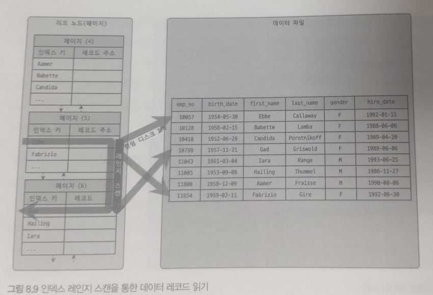 인덱스의 리프 노드에서 검색 조건이 일치하는 건들은 데이터 파일에서 레코드를 읽어오는 과정이 필요하다. 리프 노드에 저장된 레코드 주소로 데이터 파일의 레코드를 읽어오는데, 레코드 한 건 단위로 랜덤 I/O가 한 번씩 일어난다.