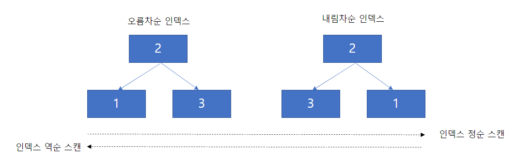 - 오름차순 인덱스 : 작은 값의 인덱스 키가 트리 왼쪽으로 정렬된 인덱스