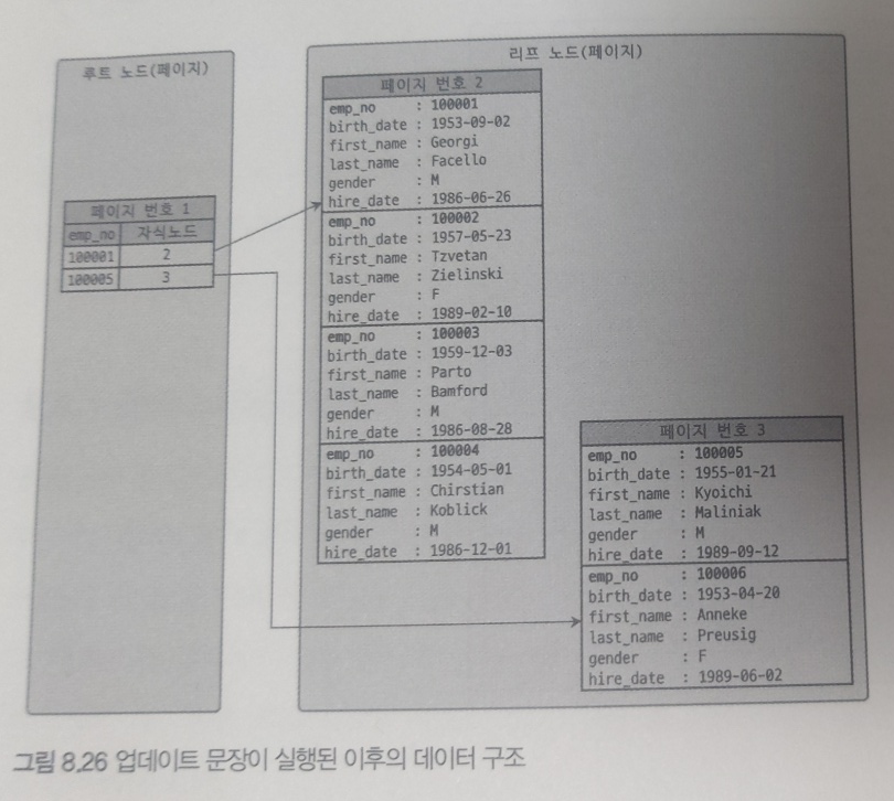위 그림에서는 emp_no가 100007인 레코드는 3번 페이지에 저장돼 있었다. 하지만 다음 그림에서 emp_no가 100002로 변경되면서 2번 페이지로 이동한 것을 알 수 있다. 실제로 프라이머리 키가 변경될 일은 거의 없지만 클러스터링 테이블에서 프라이머리 키값은 중요하다.