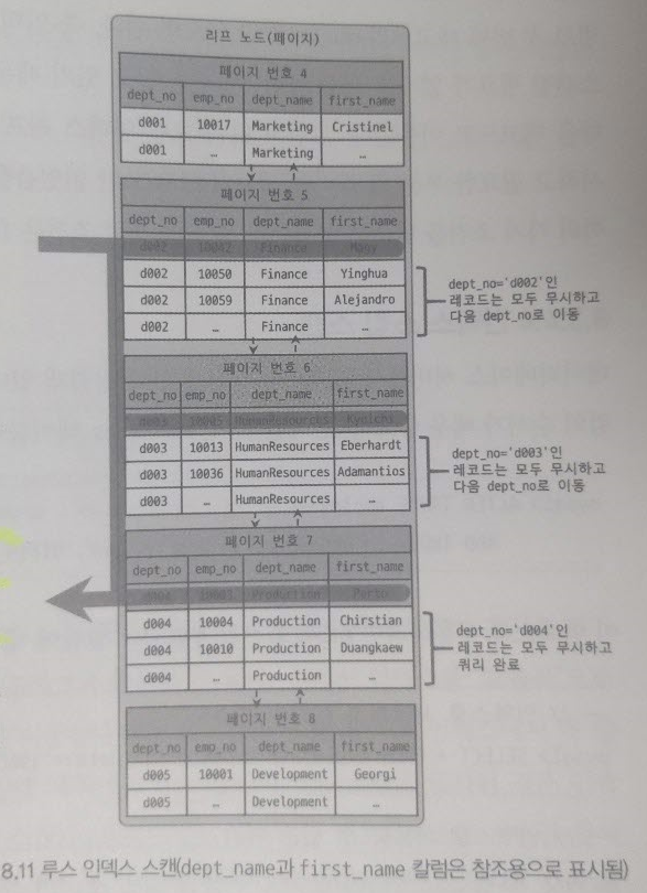 쿼리에 사용된 dept_emp 테이블은 (dept_no, emp_no) 조합으로 인덱스가 생성되어 있다. 따라서 해당 컬럼으로 정렬이 되어 있기 때문에 dept_no 그룹 별로 첫 번째 레코드의 emp_no 값만 읽으면 된다. Where 조건을 만족하는 범위 전체를 다 스캔할 필요가 없다는 것을 옵티마이저는 알고 있기 때문에 조건에 만족하지 않는 레코드는 무시하고 다음으로 넘어간다.