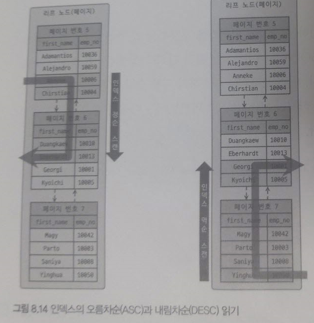 인덱스를 생성할 때 정렬 규칙에 따라 키 값은 항상 오름차순이거나 내림차순으로 정렬되어 저장된다. 어떤 인덱스가 오름차순으로 정렬되옸다고 항상 오름차순으로만 읽을 수 있는 것은 아니다. 읽는 방향은 옵티마이저가 판단하여 최적화된 실행계획에 따른다.