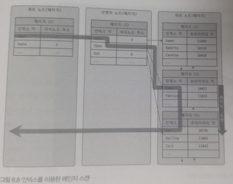 - 인덱스 정순 스캔 : 인덱스 키의 크고 작음에 관계없이 인덱스 리프 노드의 왼쪽 페이지부터 오른쪽으로 스캔