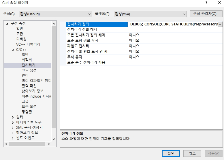 추가적으로 libcurl 정적 라이브러리를 사용하는 경우 전처리기에 CURL_STATICLIB 정의를 추가해야한다.