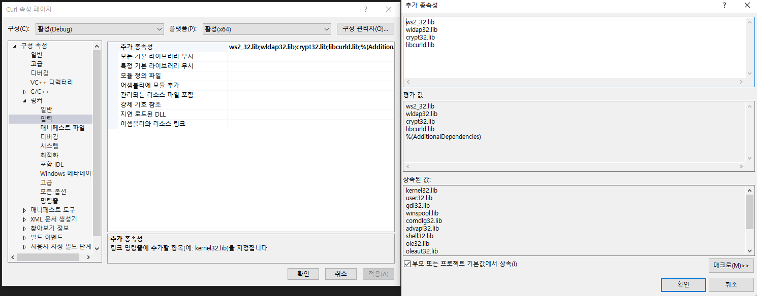 또한 libcurl 정적 라이브러리가 정적으로 참조하는 라이브러리를 추가해야한다. 윈도우 소켓이나 암호화 관련 라이브러리이다.