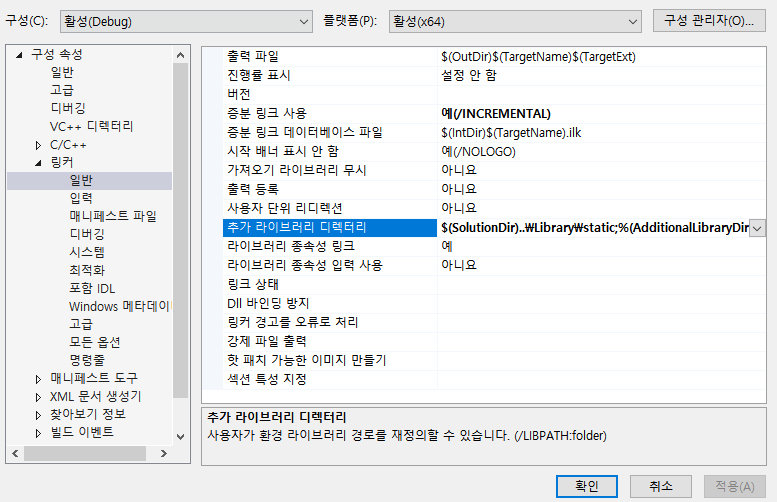 출력 라이브러리는 build/Win64(32)/VC17/($Configuration) 폴더내에 생성된다.