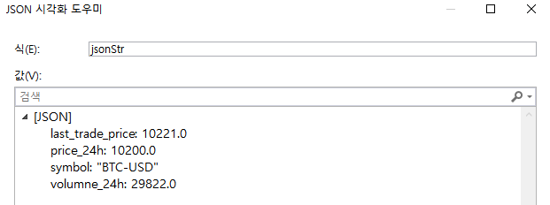 VS에서 JSON 시각화 도우미로 확인한 JSON 스트링값은 다음과 같다.