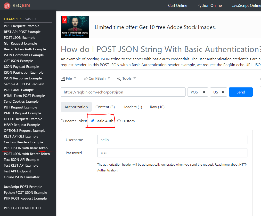 https://reqbin.com/req/o3vugw0p/post-json-string-with-basic-authentication