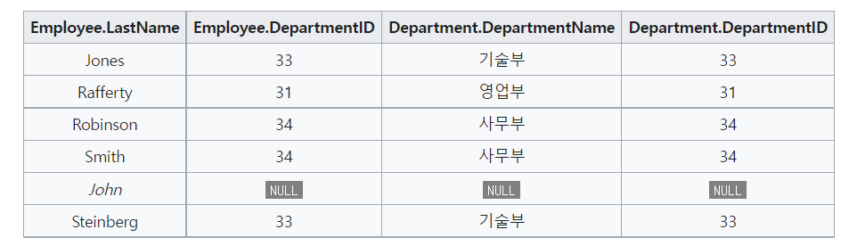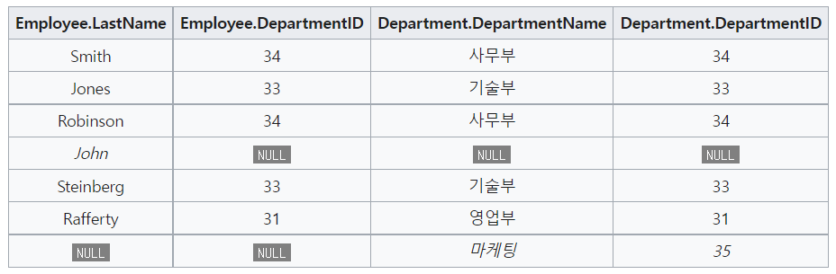 비교하는 컬럼값이 없는 레코드이더라도 기준이 되는 (LEFT, RIGHT) 테이블의 레코드는 항상 포함되도록 하는 조인 방법이다. 비교하는 컬럼값이 없을 경우 NULL로 표시된다.