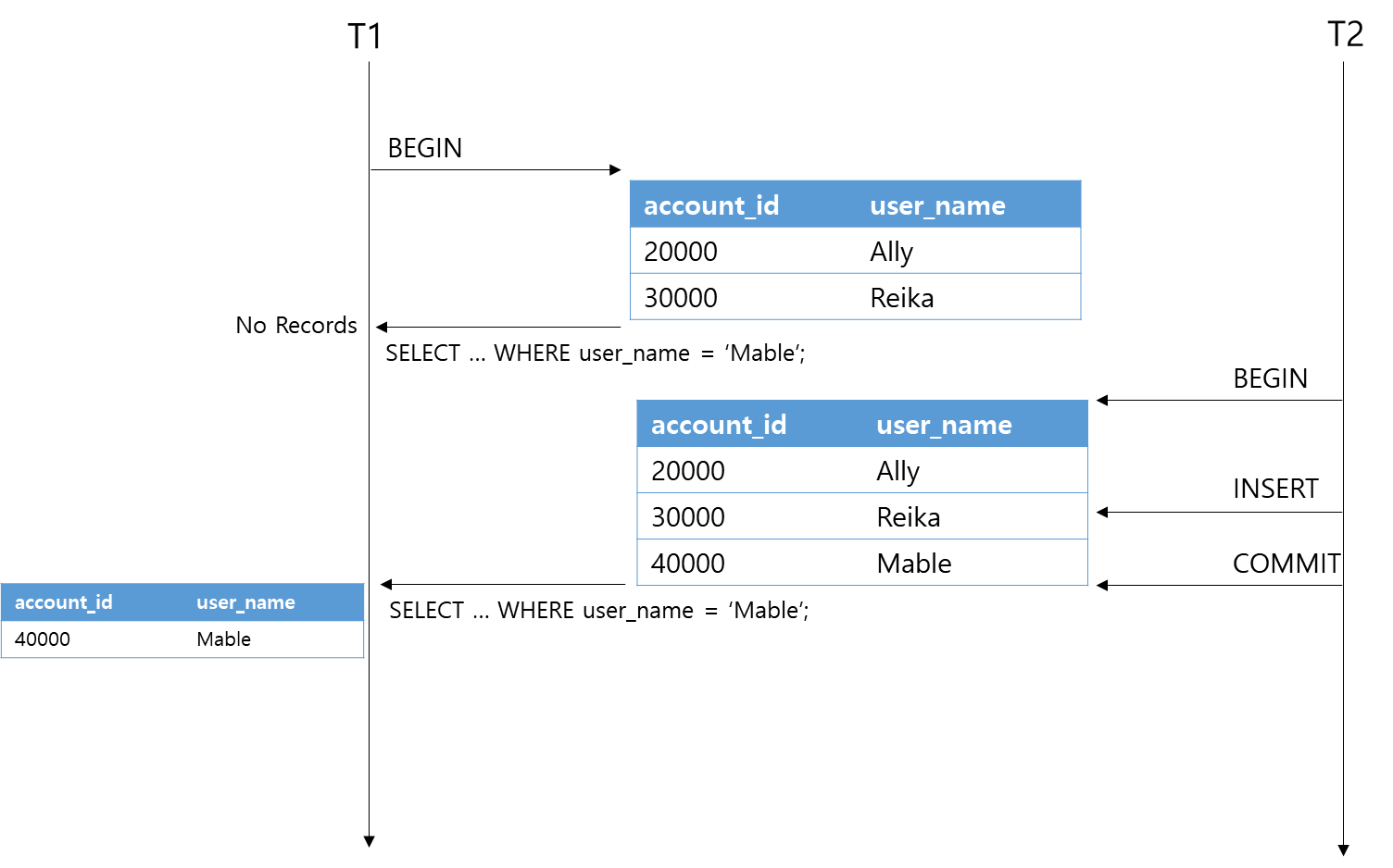 트랜잭션 T1에서 Mable이라는 이름을 가진 레코드를 검색하면 T2에서 커밋된 레코드를 읽게된다.