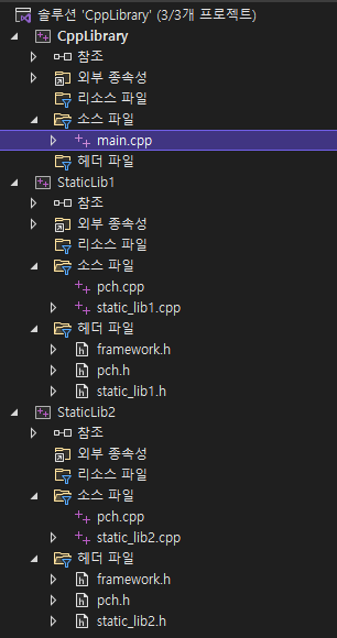 CppLibrary(나의 프로젝트) -> StaticLib2 -> StaticLib1 (위와 같이 빌드 순서를 설정하면 좋다.)