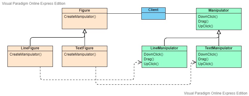 - 이 때 LineFigure와 LineManipulator는 서로 다른 수퍼 클래스를 가지고 있지만 LineFigure 내에서 팩터리 메서드를 통해 LineManipulator를 생성하고 자신에 대한 관리를 수행할 수 있게 하여 같은 계통으로 연결할 수 있게 된다.