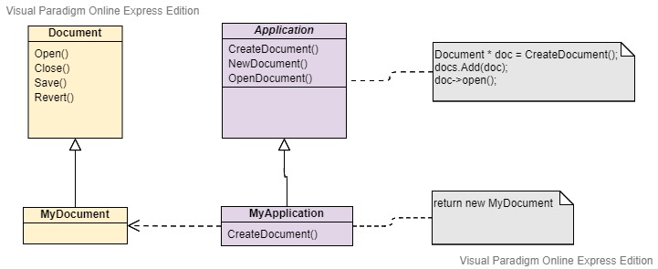 - NewDocument()의 함수 예시에서 Document* doc = CreateDocument();와 같이 CreateDocument() 함수를 이용하여 Document를 생성할 수 있다.