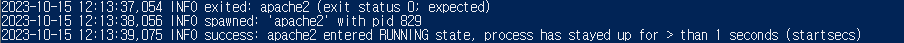위 명령어로 apach2에 해당하는 프로세스를 kill 하면 다음과 같이 supervisord 프로세스가 apache2를 recovery 하는 것을 확인할 수 있다.