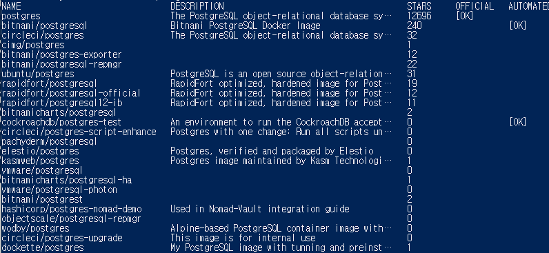 검색된 이미지 이름, 설명, 받은 스타 개수, 공인 여부, 자동화된 빌드 버전 정보를 알 수 있다.