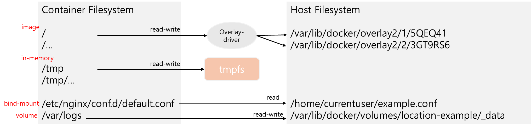 바인드 마운트 타입은 이미 존재하는 호스트 파일 시스템(파일 혹은 디렉토리 경로)으로 부터 컨테이너 파일 시스템으로 직접 맵핑한다.