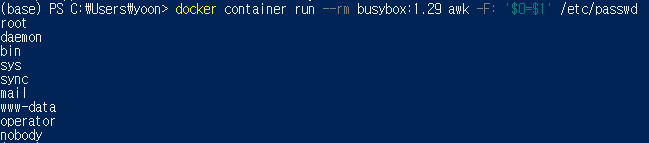 docker contaienr run --rm busybox:1.29 awk -F: '$0=$1' /etc/passwd