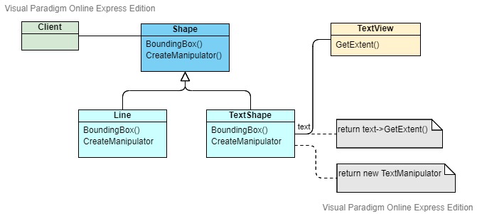 - 추상 클래스 Shape를 상속받는 Line과 TextShape 객체가 있는데 이들은 특정 모양을 나타내고 그래픽 요소로서 Client가 화면에 그리기 위한 기본 객체이다.