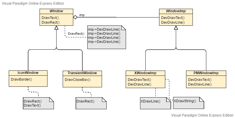 따라서 종류를 표현하는 추상부와 실제 주어진 시스템에 그리는 작업을 수행하는 구현부를 나누어 클래스 계통을 달리하고 적응자처럼 내부에서 구현부 객체에 대한 참조자를 가지고 있으면 구현 메서드를 사용할 수 있을 것이다.