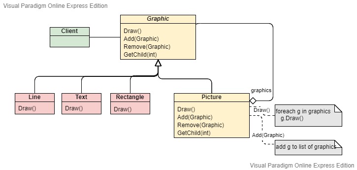 따라서 복합 객체, Graphic 클래스는 기본적인 그리기 연산 Draw()와 컨테이너에 그림 요소를 추가 Add(), 삭제 Remove(), 그림 요소 중 하나를 반환 GetChild(int) 등의 연산을 포함한다.