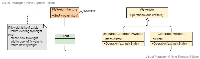 FlyweightFactory를 통해서 인스턴스를 생성하고 참조를 통해 플라이급 객체를 공유할 수 있게 한다.
