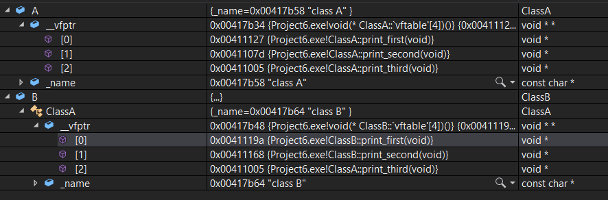 위 코드를 디버깅 모드로 살펴보면인스턴스마다 함수 포인터 배열 (void **) __vfptr 변수를 저장하고 내용으로 가상 함수 테이블을 가리키고 있다.