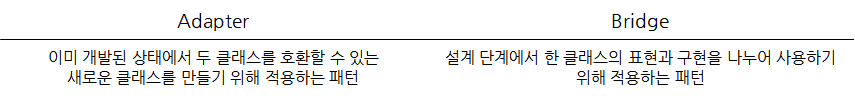 | 가교 Bridge | - 클래스 계통을 추상 표현과 구현부로 나누고 구현부 인스턴스를 통한 구현 기능을 제공. - 구현부 인스턴스를 참조자로 관리. |
