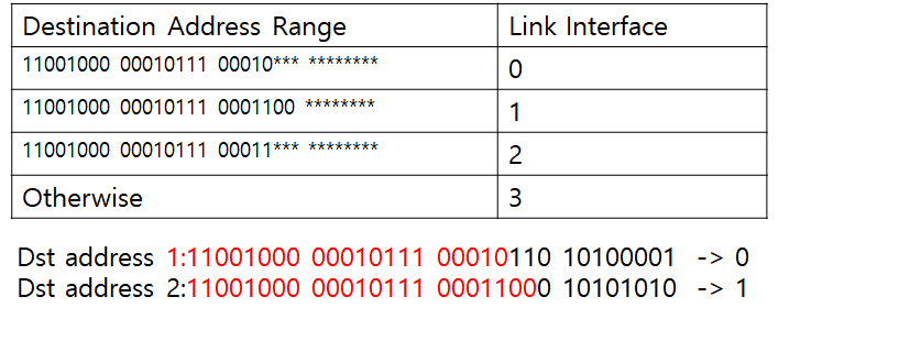 포워딩 테이블에 32 bits 주소를 모두 기록할 수 없기 때문에 출구 포드마다 주소 범위를 정해놓고 해당 출구 포트로 포워딩하도록 함.