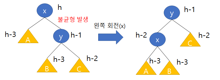 어떤 노드가 불균형하다는 의미는 두 서브 트리의 높이 차가 1보다 큰 경우를 의미한다. 높이 차를 balance factor라고 하며 이를 해결하기위해 한 노드에 대해 다음 두 회전 연산을 수행할 수 있다.